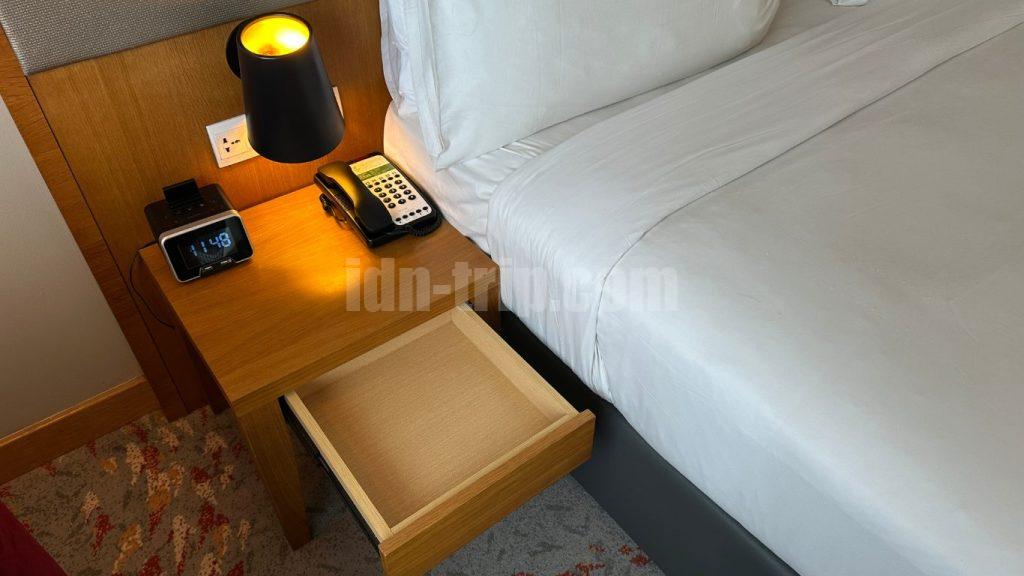 ベッドの両サイドには引き出し付き小テーブル